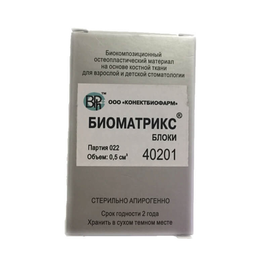 Декальцинированный материал БИОМАТРИКС блоки производства компании “Конектбиофарм” – высокоочищенный декальцинированный костный матрикс с сохраненной природной архитектоникой губчатой кости. 100% высокоочищенный ксено коллаген I-го типа. Содержит в 1 см³ не менее 1,5 мг аффинно-связанных костных сульфатированных гликозаминогликанов (сГАГ). Данный материал обладает высокой биосовместимостью с костной тканью пациента, низкой антигенностью, и не иммуногенен. Остеокондуктивный и остеоиндуктивный пористый биоматериал для заполнения объема костного дефекта или полости.