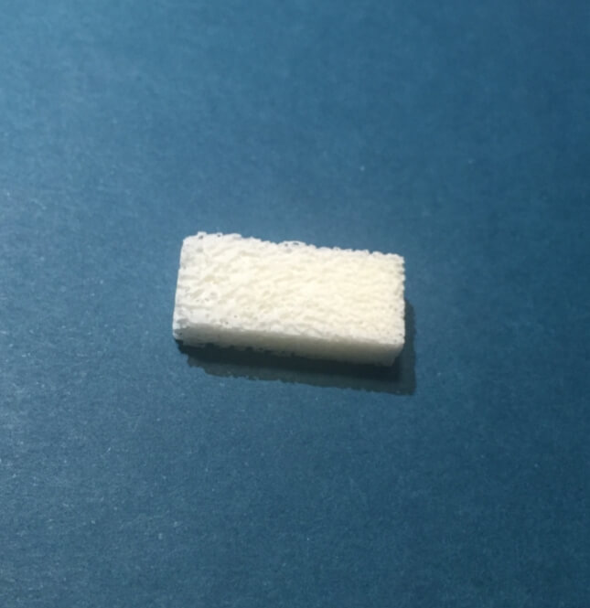 Остекондуктивный и остеоиндуктивный пористый биоматериал для заполнения объема костного дефекта или полости. Избирательное связывание костными сГАГ тромбоцитов крови (ТК) позволяет создать химически фиксированную, стабильную концентрацию ТК на материале, немедленно запуская каскад реакций формирования костного матрикса, без дополнительных манипуляций с кровью пациента. Материал характеризуется высокой биосовместимостью с костной тканью. Низкая антигенность, не иммуногенен.