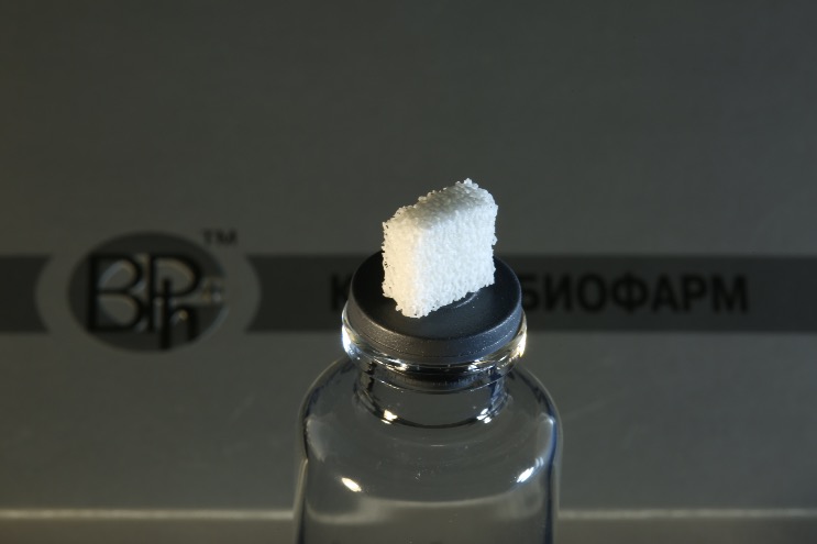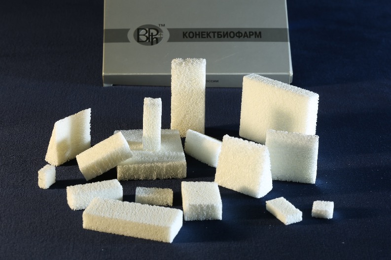 Остекондуктивный и остеоиндуктивный пористый биоматериал для заполнения объема костного дефекта или полости. Избирательное связывание костными сГАГ тромбоцитов крови (ТК) позволяет создать химически фиксированную, стабильную концентрацию ТК на материале, немедленно запуская каскад реакций формирования костного матрикса, без дополнительных манипуляций с кровью пациента. Материал характеризуется высокой биосовместимостью с костной тканью. Низкая антигенность, не иммуногенен.
